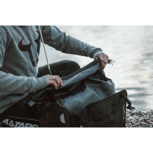 Le SysBag WP L est conçu pour une utilisation off-road : les boucles des sangles de son compartiment avant sont délibérément fixées sur le dessus afin qu'aucune branche ne puisse s'y coincer lors de passages étroits. Les bords extérieurs du sac sont recouverts d'un matériau Hypalon robuste, qui offre une protection supplémentaire en cas de chute. Les quatre sangles de compression placées des deux côtés permettent d'arrimer la sacoche pour créer une unité compacte, même avec un chargement réduit.