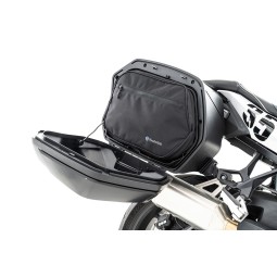 Quatre sangles latérales compriment le sac à dos en fonction de la charge. Tu peux enrouler les sangles et les fixer avec des bandes velcro afin que tout tienne en place pendant la conduite. Tu peux aussi fixer la housse de pluie pour les promenades par temps humide avec des boucles afin qu'elle repose en toute sécurité sur le sac à dos lorsque tu roules à grande vitesse.