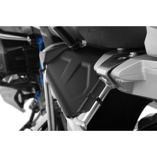 Les deux caches obturent les ouvertures entre les porte-bagages et le cadre arrière, et donnent une apparence extérieure harmonieuse. Les saletés tourbillonnantes, les projections de pierres et les aspersions d'eau sont captées ou déviées. L'encrassement ou le risque de détérioration des coffres sont ainsi considérablement réduits ou évités, de même qu'il est évité au passager d'être sali ou trempé.