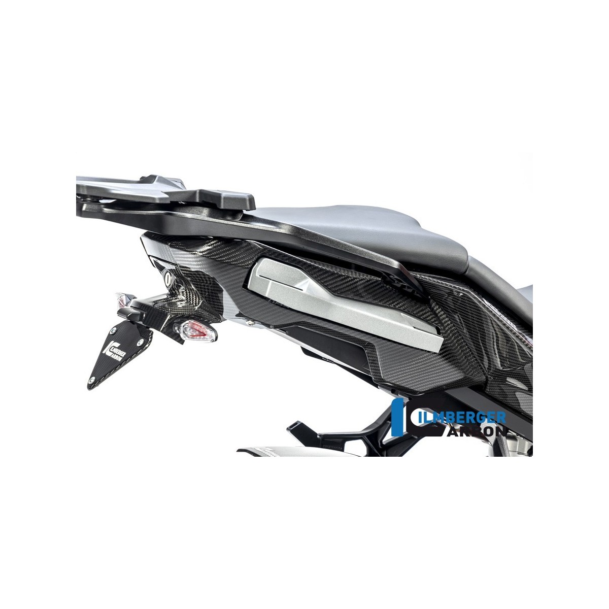 Le carénage du cadre arrière en carbone remplace la pièce d'origine sans restreindre la gamme de fonctions. Les porte-bagages ainsi que les poignées pour le passager restent intacts et le passager et la valise peuvent être emmenés sur la route. En utilisant du carbone de haute qualité, jusqu'à 70 % du poids peut être économisé par rapport à l'original. Le comportement de conduite est optimisé, le plaisir de conduire est augmenté et la sécurité est améliorée.