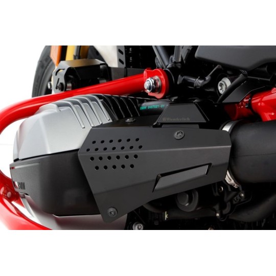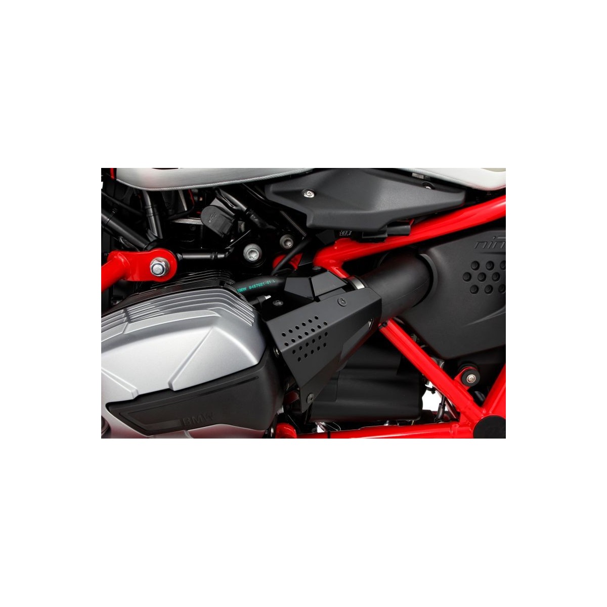 Le capot du système d'injection protège la zone d'admission, tout le tube d'injection, les raccordements de conduits et le capteur de papillon des gaz. Il apparaît toujours des défauts d'étanchéité aux connecteurs, qui sont à attribuer à la multiplication des accrochages avec les bottes ou le pantalon. Avec ce capot protecteur en aluminium anodisé, ce n'est plus possible. Il protège en plus contre la manipulation des embouts et des connecteurs.