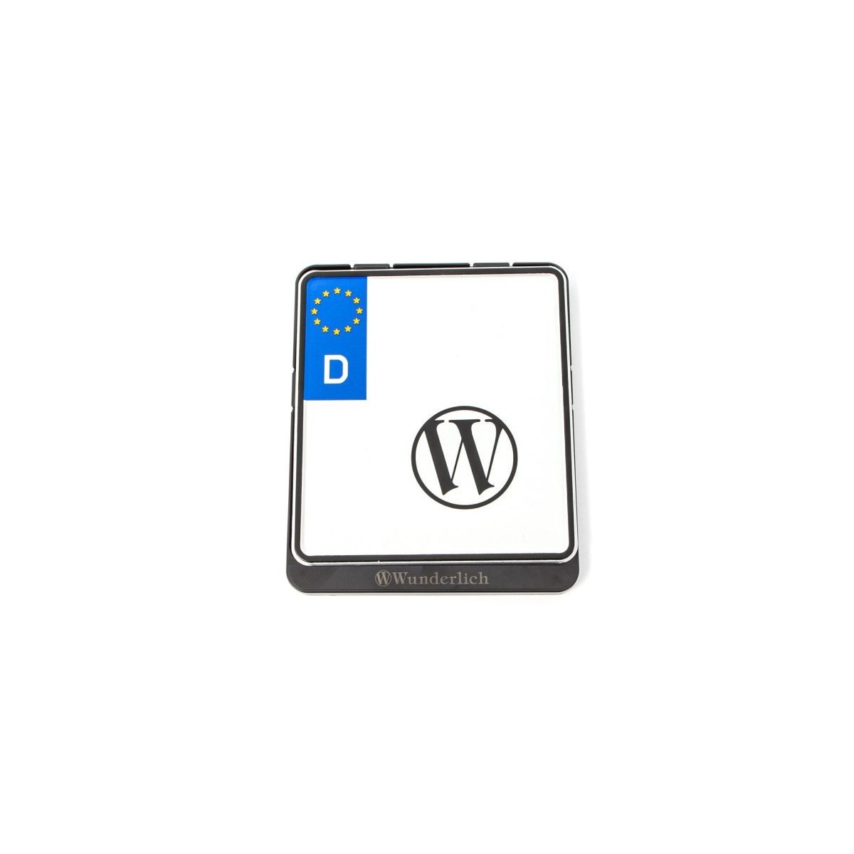 Ce support de plaque d´immatriculation permet un montage sans trous et vis non esthétiques – une fois monté la plaque d´immatriculation est fixée sans vissage. Cela évite non seulement les vis laides ou couvercles inesthétiques. La plaque d´immatriculation s´en trouve renforcée et ne se déchire plus. Elle est fixée par plusieurs clips de serrage et une perte est exclue. Avec le logo et l´inscription Wunderlich.