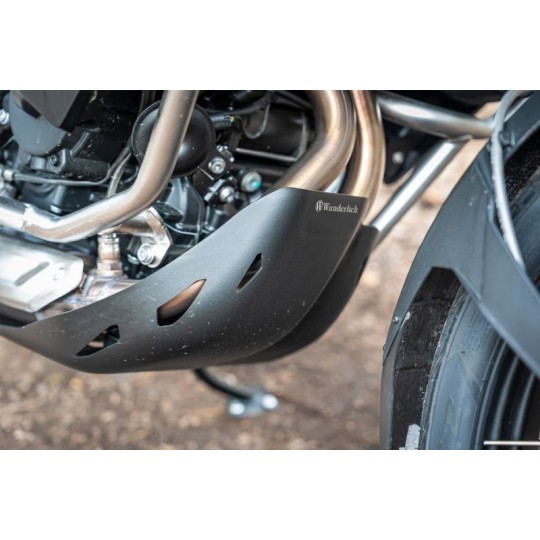 Elle épouse si étroitement le groupe que, d’une part, cela réduit la surface d’attaque frontale, mais la liberté d’inclinaison et la garde au sol demeurent presque identiques. La forme de la protection réduit la surface d’attaque et évite l’accrochage ou le blocage désagréables en tout terrain, qu’ils soient causés par des branchages, des éboulis ou des rochers. Les orifices veillent à ce que l’eau puisse s’écouler librement après la traversée de rivières.