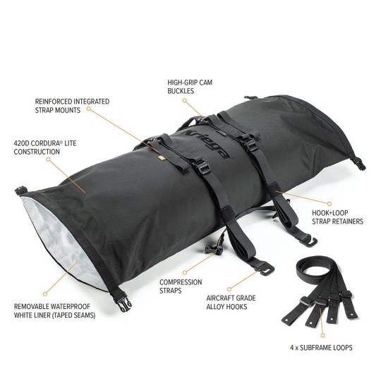 Fabriqué à partir d’une coque extérieure en Cordura® LITE 500D et d’une doublure intérieure à coutures étanches. Le sac est conçu pour résister aux conditions les plus difficiles, offrant une protection maximale à vos effets personnels. La fermeture à double extrémité offre une solution imperméable flexible avec un accès facile par les deux extrémités. Le ROLLPACK est conçu pour s’adapter en toute sécurité à un porte-bagages arrière ou à un siège passager. Il peut être enroulé et transporté sur le vélo ou dans un sac à dos lorsque vous avez besoin d’un espace de rangement supplémentaire. Pour une mise en place rapide et facile, les sangles intégrées à boucle à came passent autour du cadre du vélo et s’accrochent au sac. De plus, des boucles pour le sous-châssis sont incluses pour les motos dont le cadre ou le porte-bagages n’est pas visible. Une fois le sac installé sur la moto, il suffit d’accrocher les sangles intégrées aux boucles du faux-châssis et de les serrer. D’une capacité de 20 litres, ce sac à dos offre suffisamment d’espace pour ranger vos affaires sèches, avec une qualité de fabrication inégalée.