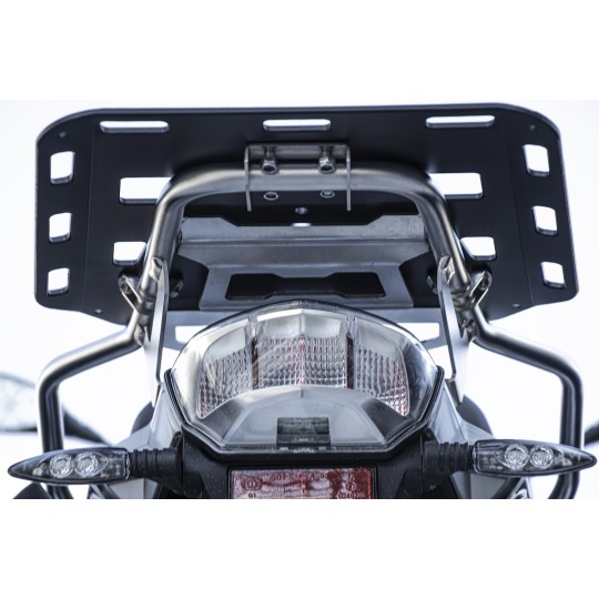 Le porte-bagages est pré-percé pour une intégration facile avec les supports Rotopax, vous permettant de transporter des packs de carburant et d'eau. L'installation est rapide et simple grâce au matériel inclus. Disponible en finition noire.