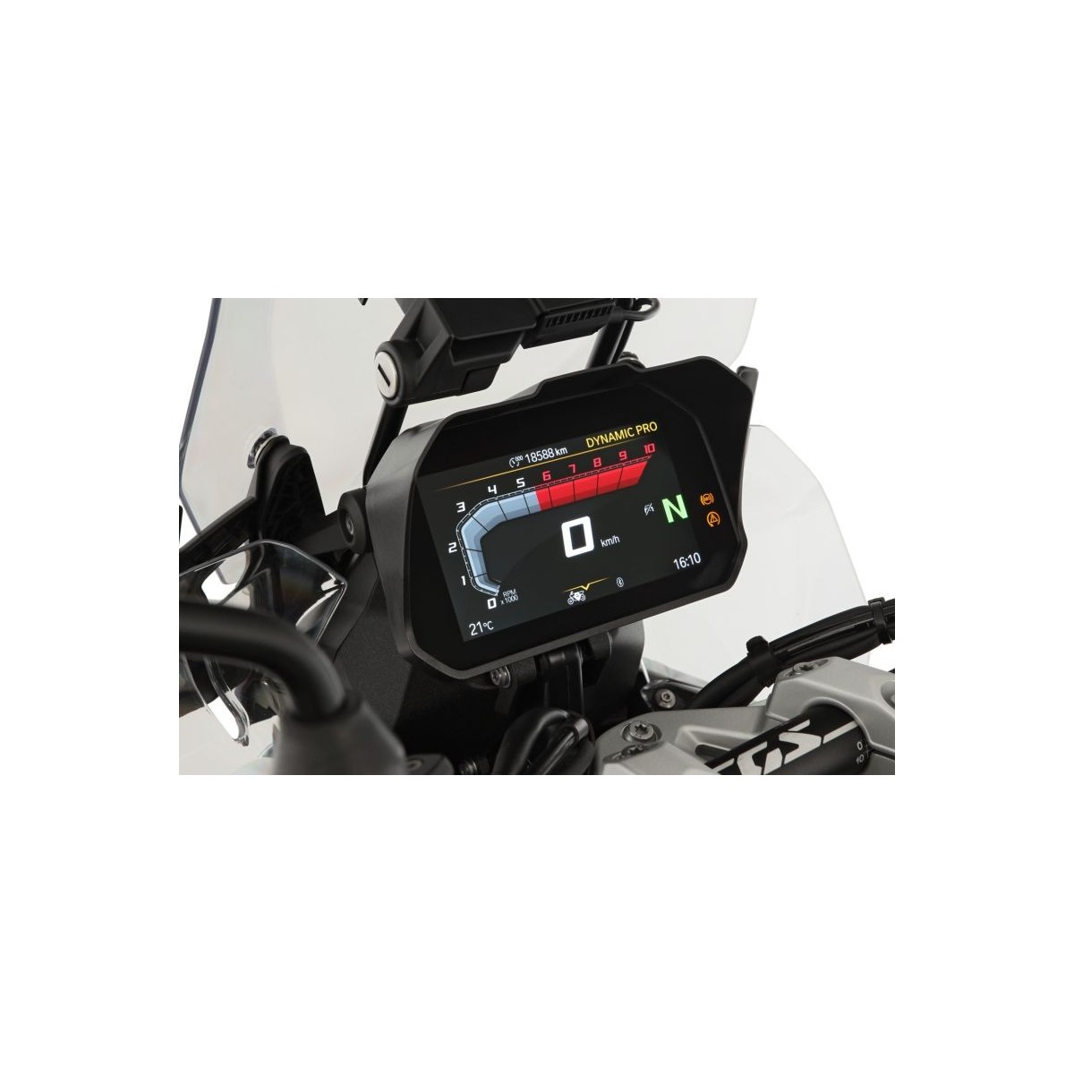 Avec ce pare-soleil de haute qualité et à trois côtés, le cockpit TFT 6,5 pouces du combiné d'instruments BMW Connectivity reste parfaitement lisible même en cas de soleil bas grâce à une ombre optimale. Le Shift-Light-Channel SLC intégré guide le regard de manière ergonomique et permet une reconnaissance visuelle rapide et intuitive du signal lumineux du passage de vitesse. Le système de clips éprouvé, ajusté avec précision et stable, garantit un maintien sûr, même en cas de chocs violents, de vibrations (par exemple en tout-terrain) ou de vents violents.