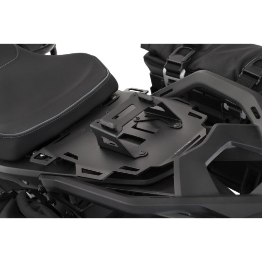 Ce support propose de nombreux avantages et une grande utilité, car les CLICK BAGs peuvent être utilisés comme sacs arrière robustes, rapidement fixés ou retirés en cours de route. Trois versions sont disponibles avec un volume de 3, 6 ou 11 litres – sans tenir compte du volume d’extension. Pour la fixation, la sacoche est insérée par le haut dans les deux ergots de verrouillage – ajustables en deux positions – jusqu’à ce que le verrouillage automatique s’enclenche. La sacoche peut être déverrouillée par une sangle fixée sur le sac – une seule traction suffit. Le CLICK BAG peut être monté dans une position pivotée de 180°. L’installation du support CLICK BAG est rapide et facile.