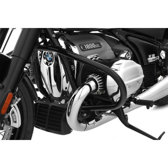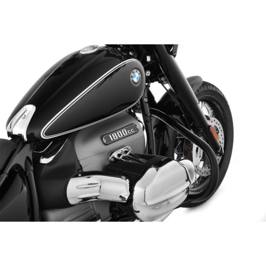 Le premier pare cylindre en tube de 32 ! Nous avons opté pour cette dimension de tube pour deux raisons : Pour des raisons de rigidité, pour protéger idéalement la R 18, et pour des raisons esthétiques. Car seul le tube de 32 est à la fois équilibré et esthétique sur l’imposante R 18 et ses puissants collecteurs d’échappements. De plus, nous avons délibérément opté pour une forme fermée monopièce de l’arceau de protection, qui, outre ses dimensions, contribue à une rigidité constructive supplémentaire. L’arceau de protection à revêtement poudré de qualité supérieure ennobli d’un vernis incolore, parfaitement adapté au cadre, s’harmonise sobrement avec le style de la R 18 tout en apportant cependant son cachet particulier. Ce n’est pas un hasard si la forme Pik rappelle les pares cylindres des boxers BMW classique à refroidissement à air.