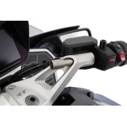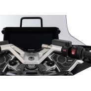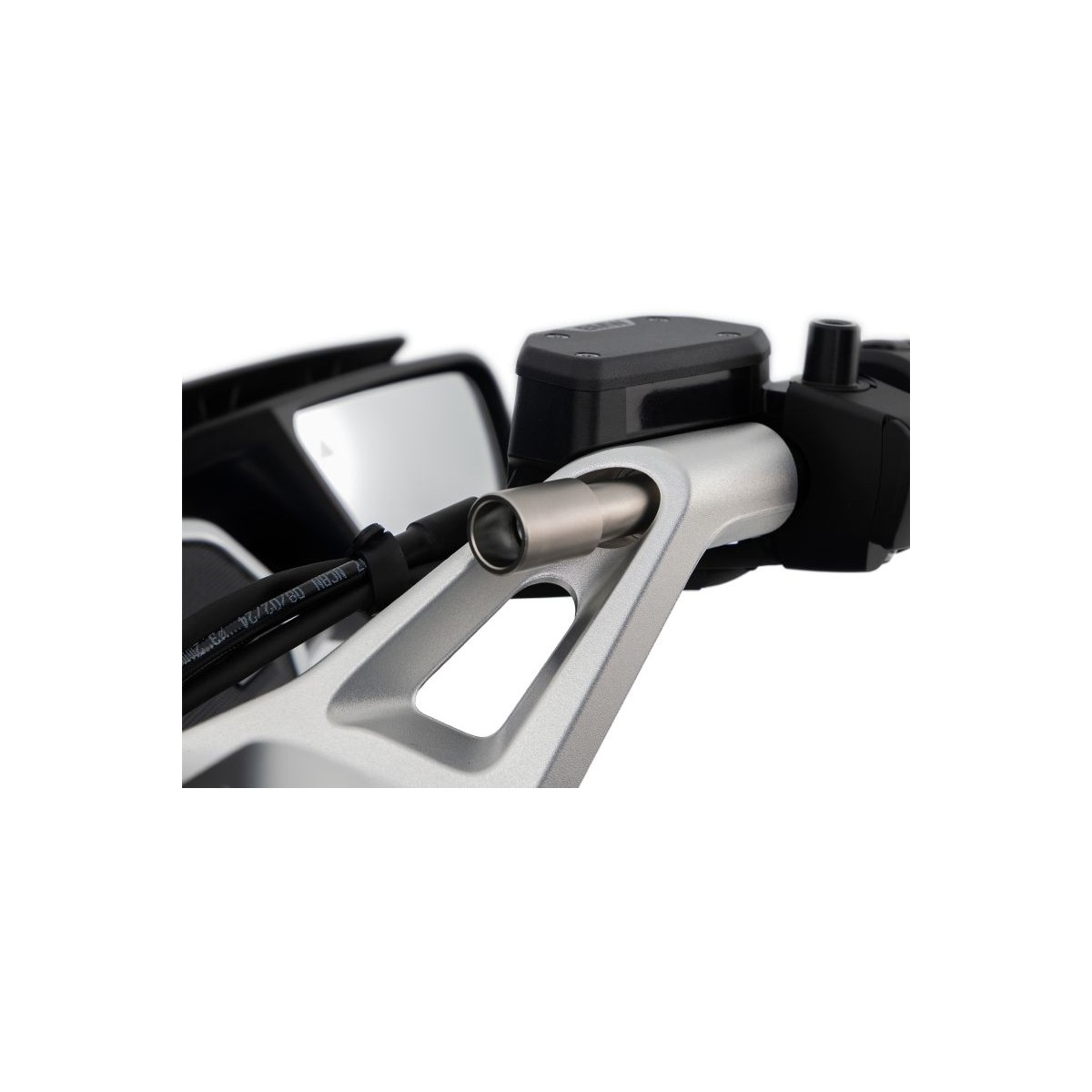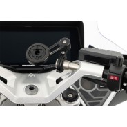 Cet adaptateur prolonge la fixation du guidon vers le centre du pont de fourche supérieur, permettant ainsi de fixer un support tube rond – par exemple de Peak Design, SP-Connect, MULTICLAMP ou d’un autre système compatible 22 mm. Il permet de positionner le smartphone dans le champ de vision du pilote pour l’utiliser comme système de navigation – sans gêner la visibilité du tableau de bord.