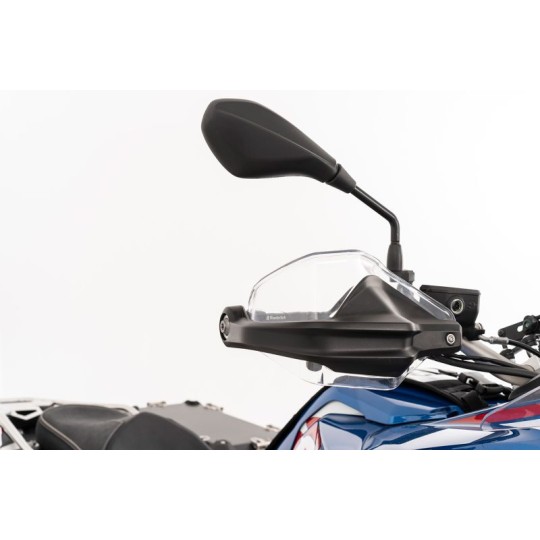 Avoir les mains froides, moites ou humides n’est pas agréable, tout comme les projections de pierre, les saletés de la route de toute nature ou l’impact des insectes à haute vitesse. Avec notre extension de protège-mains, nous agrandissons considérablement la zone de protection des protège-mains d’origine : Nous la faisons passer en hauteur, en largeur, et encore latéralement autour de la main jusqu’à l’extrémité du guidon. Il est difficile d’assurer plus de protection, mais une telle protection doit être belle. Avec ces dispositions, nous améliorons de façon décisive l’efficacité de la protection. Pour drainer l’eau, nous avons prévu le bord supérieur avec une collerette en saillie vers l’extérieur qui fait s’écouler l’eau projetée vers l’extérieur et latéralement. La version transparente est fonctionnelle et plaisante.