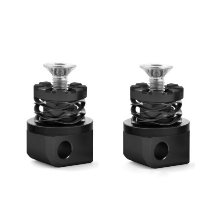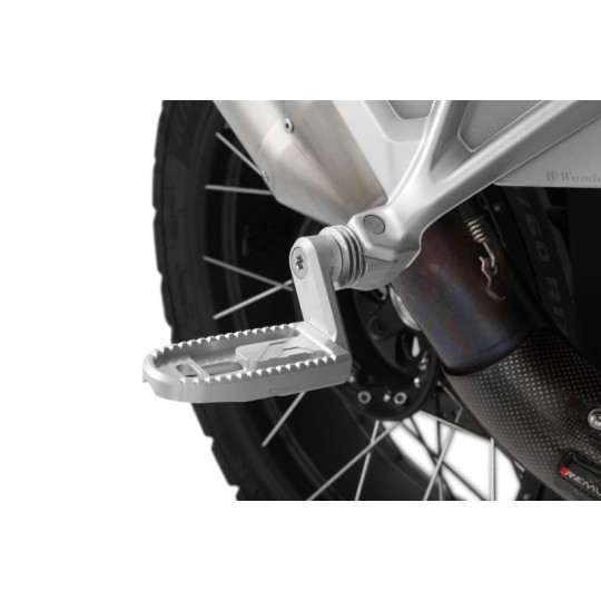 Notre système à crans Vario constitue la solution ultime lorsqu'il est question de repose-pied réglable. Aucun souhait ne reste insatisfait avec une plage de réglages de 100 mm de diamètre. Peu importe que le pied soit plus ou moins grand, qu'il faille augmenter la liberté d'inclinaison ou simplement soulager agréablement l'angle des genoux. Les huit possibilités de réglage sur 360° procurent une énorme flexibilité. Ce gain de confort s'adresse au conducteur comme au passager. Pour les conducteurs sportifs, nous proposons également les crans en forme inclinée. La livraison se fait toujours avec Homologation de type allemande. Toutes les pièces sont en aluminium haute résistance et anodisées argent ou noir.