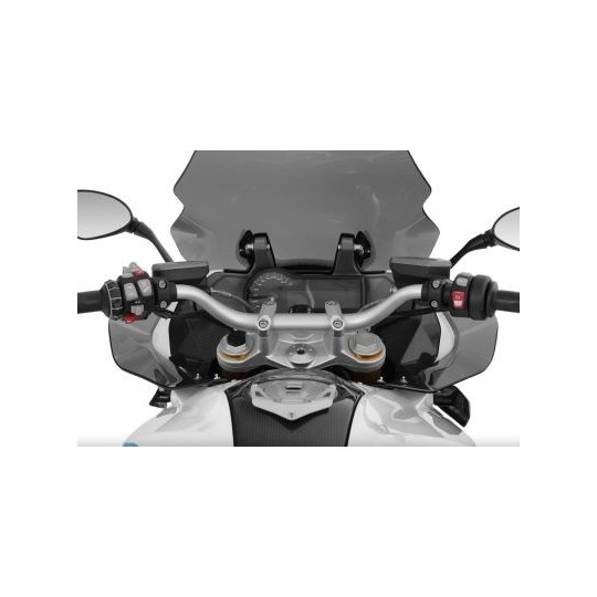 Composant extrêmement utile et ergonomique. Optimise le rapport de levier, pas seulement lorsque la machine est à pleine charge. Ce levier de cric dépliable se monte à gauche sur le cadre à l’aide d’une console solide parfaitement adaptée. Une résistance à la torsion supplémentaire, articulée sur le support du porte-bagages et du repose-pieds, veille à la stabilité. Une fois déplié, la machine peut être placée de manière nettement plus facile et surtout sûre sur la béquille principale. Cela est dû au fait que le cric antidérapant tient bien en main et permet de transmettre nettement plus de force que sur les tubes du châssis, qui sont difficiles à saisir ou qui ne sont absolument pas accessibles à cause des bagages. Une fois le levage au cric effectué, ce dernier disparait discrètement dans sa position de repos. Un mécanisme veille à l’arrêt sûr du cric en position repliée. Nous fabriquons notre cric en aluminium de très haute qualité, le design est fonctionnel.