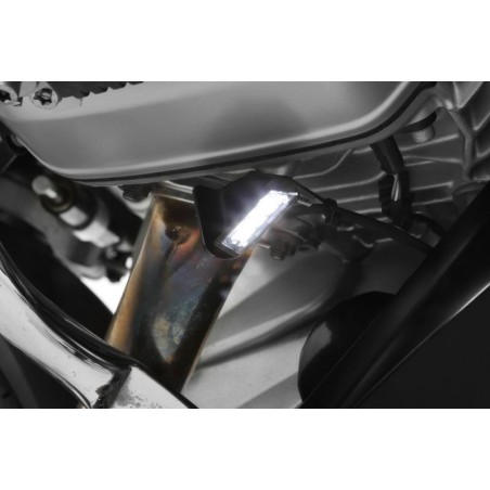Allumage par appui sur un bouton. L'éclairage de béquille latérale facilite la recherche, la nuit, d'un terrain approprié, stable.