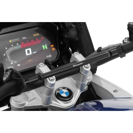 Le guidon de haute qualité en aluminium, a un diamètre de 12 millimètres et la surface est sablée. En plus de l'accent mis sur l'aspect offroadtypischen, il constitue également une base idéale pour la fixation d'accessoires. La fixation de la jambe de force centrale sur le guidon est réalisée avec du Reduzierhülsen élastique, de manière à assurer un découplage de la jambe de force et du guidon. Ainsi, en particulier des dispositifs électroniques peuvent être montés amortis par vibrations.