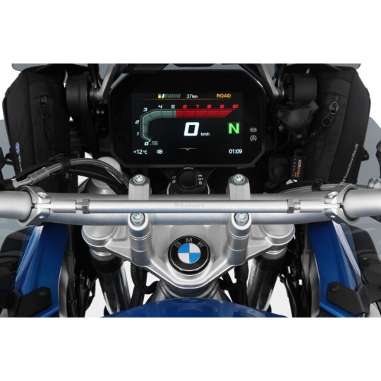 Cette barre centrale de guidon de grande qualité en aluminium a une longueur de 250 mm et un diamètre de 12 millimètres, la surface est microbillée. La largeur s'ajuste de manière individuelle à différentes formes et diamètres de guidon. Les logements sont également compatibles avec des guidons à double renfort. Outre à des fins d'accentuation de l'apparence Offroad, elle sert également de base parfaite pour accrocher des accessoires. La fixation de la barre centrale sur le guidon s'effectue avec des manchons de serrage souples garantissant une désolidarisation de la traverse et du guidon. Cela permet de fixer notamment des appareils électroniques à l'abri des vibrations.