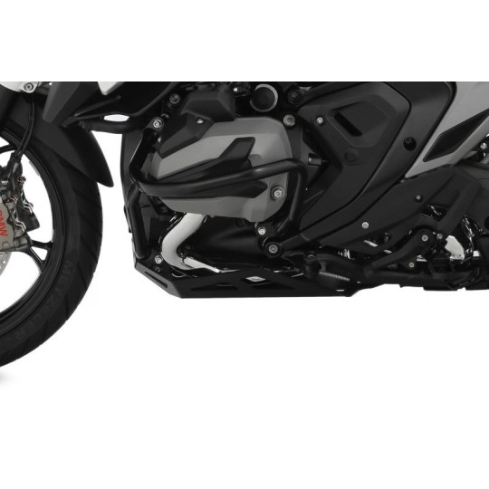 La protection moteur de haute qualité est fixée de manière sécurisée à l'aide de points de connexion précis déjà présents sur le véhicule. Les forces et moments externes sont répartis sur les montants pour réduire les charges et moments de pointe. Les vibrations sont efficacement absorbées. Typiquement Wunderlich, une attention particulière a été portée à un accès non limité pour les travaux d'entretien, par exemple en prévoyant une ouverture pour une vidange d'huile sans entrave. La protection moteur en aluminium est résistante à la corrosion et revêtue de noir. Avec le logo de la marque Wunderlich.