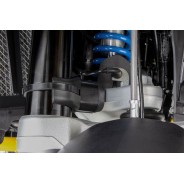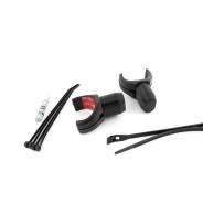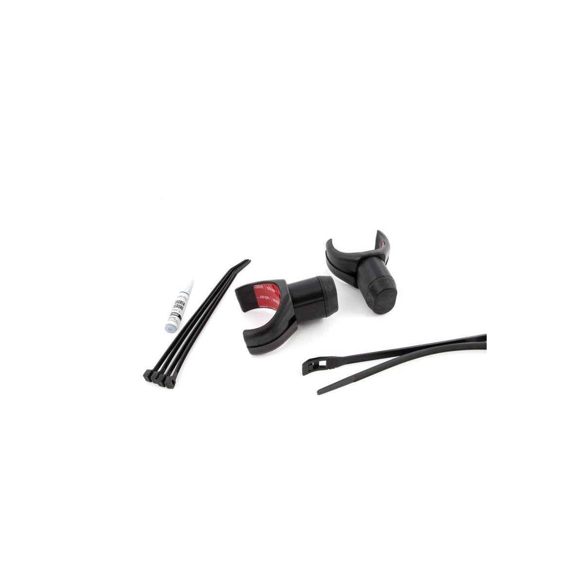 Le montage des deux limitations de butée de direction est incroyablement simple : Elles sont d’abord fixées avec un ruban adhésif 3M de qualité supérieure positionné de manière masquée sur les fourreaux de fourches, et positionnées en supplément avec une attache pour câble robuste, qui s’intègre discrètement dans la rainure circonférentielle prévue.