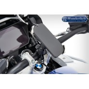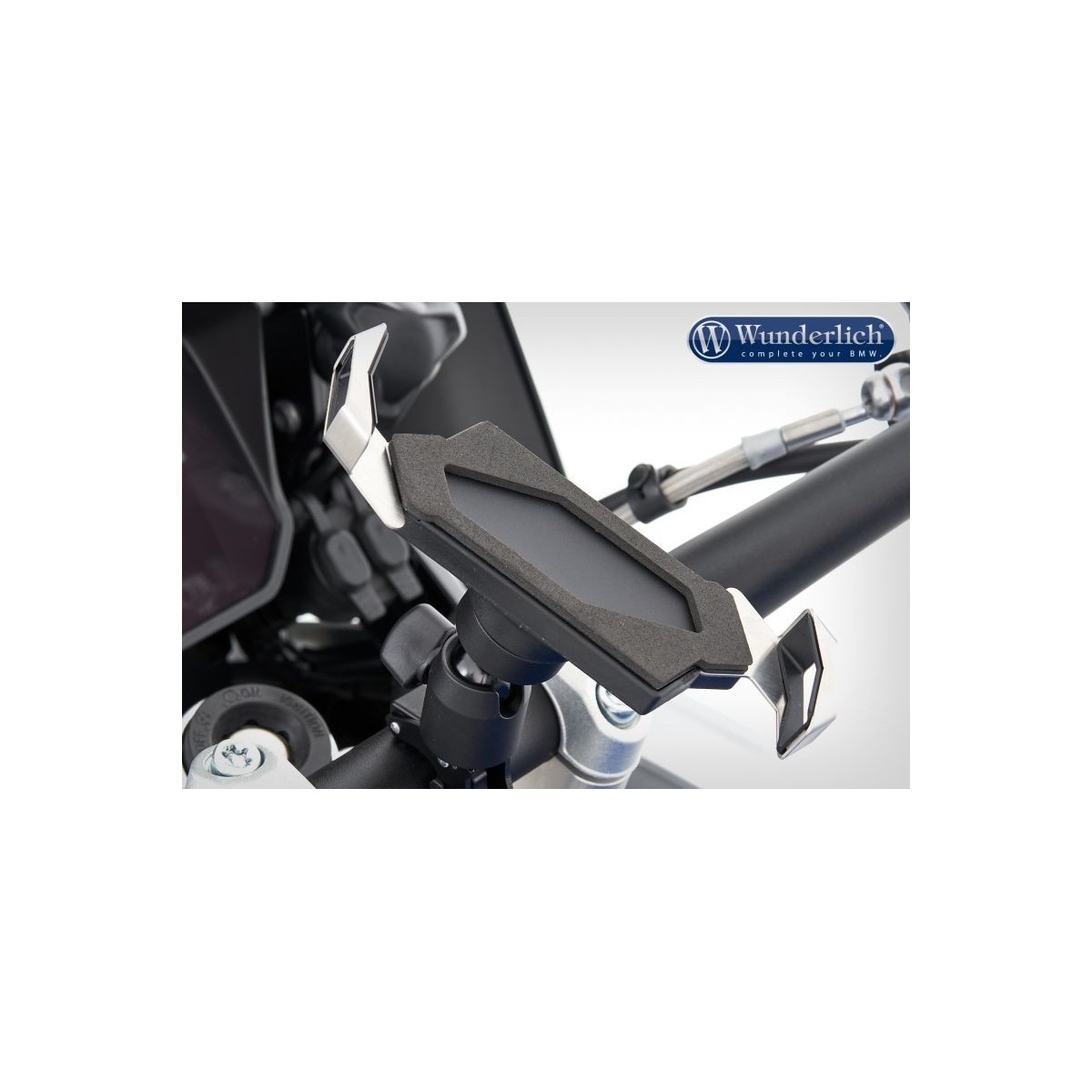 Support de smartphone innovateur et polyvalent à fixer sur le guidon avec la bride de serrage universelle MULTICLAMP (45155-002) et Support rétroviseur MULTICLAMP (45155-302) ou le boîtier de charge USB Wunderlich - "MultiClamp" (21177-102) pour la préparation de la navigation BMW montée en usine (Navigator V, VI). Réglage en continu, adapté aux smartphones d’une longueur de 135 à 180 mm. Le smartphone respectif est emboîté en toute sécurité sur deux angles opposés en diagonale. La surface d’appui est dotée d’éléments en caoutchouc mousse, de manière à protéger le smartphone et à le loger à l’abri de vibrations. Le système de serrage peut ensuite être verrouillé pour des raisons de sécurité. Le raccordement du support de smartphone avec la bride de serrage universelle MULTICLAMP se fait par Quick Release System. L’angle (en continu) et l’orientation du smartphone en format paysage ou portrait, peuvent être réglés individuellement.