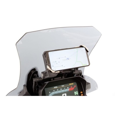 Le filetage de vis central sert à accueillir notre adaptateur MultiClamp compris dans ce kit. Vissé, il peut servir à l’accueil de smartphones. Le support pour smartphones MultiClamp (45155-102) est ici nécessaire en plus.