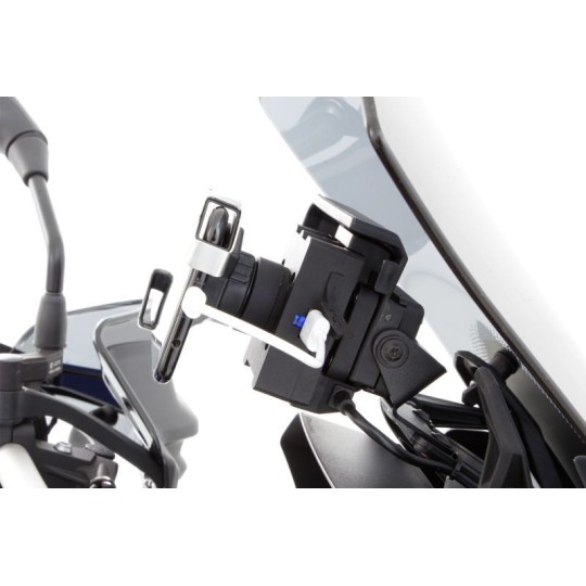 Notre boîtier de chargement est doté de quatre vis sur le devant. Ces dernières sont positionnées de manière à correspondre à divers systèmes de fixation à configuration de perçage normée, comme par exemple aussi le support de l’appareil de navigation Garmin Zumo XT. Ces systèmes de fixation se fixent ainsi en un clin d'œil de manière sûre et peu encombrante sur le boîtier de chargement et assurent l’alimentation électrique des appareils.