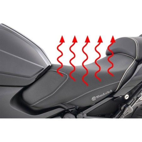 La conception sophistiquée permet d’éviter « l’usure » du rembourrage de manière fiable, et de repartir uniformément la pression exercée sur la selle sur une plus grande surface, ce qui entraîne une charge compressive spécifique nettement plus réduite au niveau de l’assise. Agréable ! La forme ergonomique de la mousse spéciale soulage en outre le coccyx, sensible à la pression. Elle offre un maintien parfait et un contrôle sûr et actif en cas de sortie accélérée, en particulier aussi lors du freinage : Qui ne connait pas cela, lorsque le passager pousse soudainement de l’arrière lors de la manœuvre et que l’on doit s’appuyer soudainement, tout en devant piloter, dans une situation de freinage éventuellement critique. Grâce au contour de maintien mis au point spécialement par Wunderlich, ces moments de frayeur lors du freinage sont relégués au passé. Le contour 3-D ergonomique et innovateur veille également à faire oublier les points de pression au niveau de l’intérieur des cuisses en se levant au feu rouge.