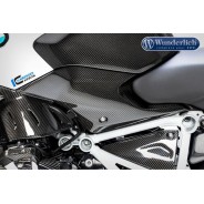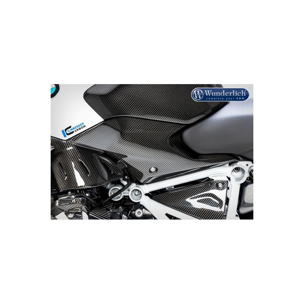 Le matériau aérospatial génère un gain de poids pouvant atteindre 70% par rapport à une pièce de série, et, avec sa rigidité spécifique au poids, exploite tout son potentiel. La forme suit en outre à chaque fois la fonction et s'intègre optimalement dans le design de la moto. Parallèlement, les lignes de la machine en objet sont prises en compte, de même que le matériau et la texture de surface des composants de série attenants. Ce composant en carbone souligne la prétention high-tech de votre BMW avec l'aspect unique du véritable carbone.